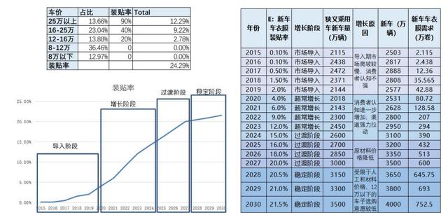 市场的发展都会经历着爆发期,过渡期,稳定期和衰退期,目前隐形车衣市场还处在爆发式增长的中后期,未来十年的发展仍非常乐观。如果把车辆售卖金额做一个区分,同时给与不同销售价格的车衣以不同的装贴率,得到隐形车衣最终的装贴率大概在 24%-25%,与目前的 9%相比,仍有不少增长空间。